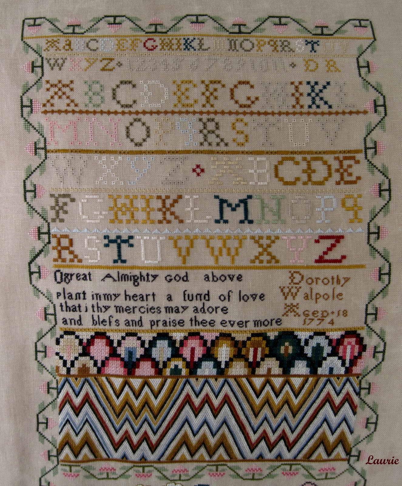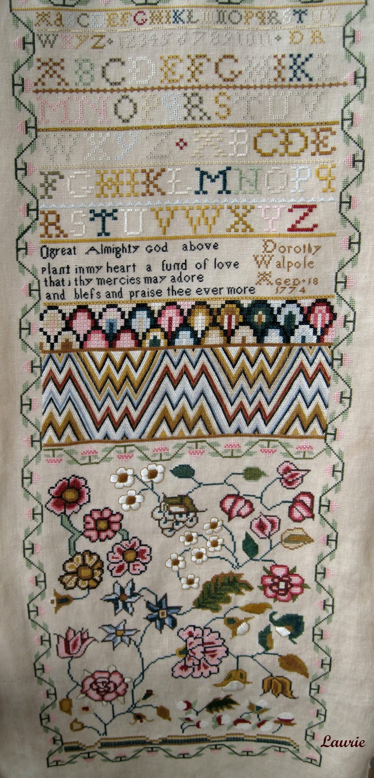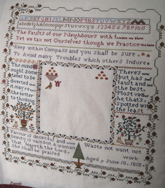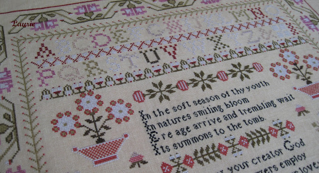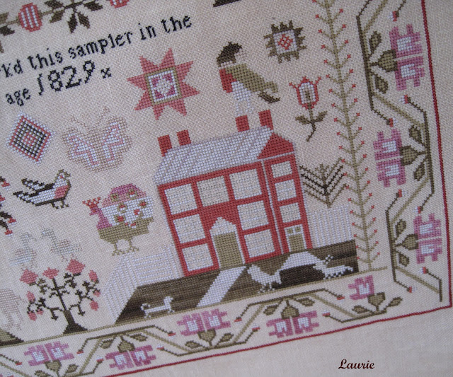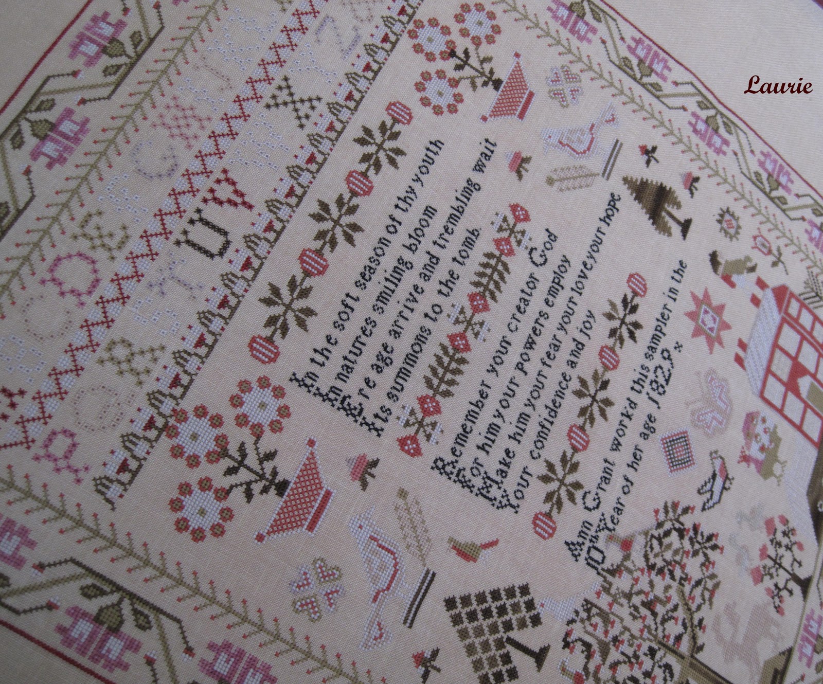 I also finished Ann Grant last night. Annie G. was such a joy to stitch. I loved the colors in this sampler and the lovely eyelet stitch alphabet. For some reason the tree in the bottom left hand corner of the sampler gave me fits. I kept loosing my place on the chart which added to the difficulty of getting all those branches stitched correctly. It's a dreary, cloudy day today and the linen color did not come out true to color on my photos.